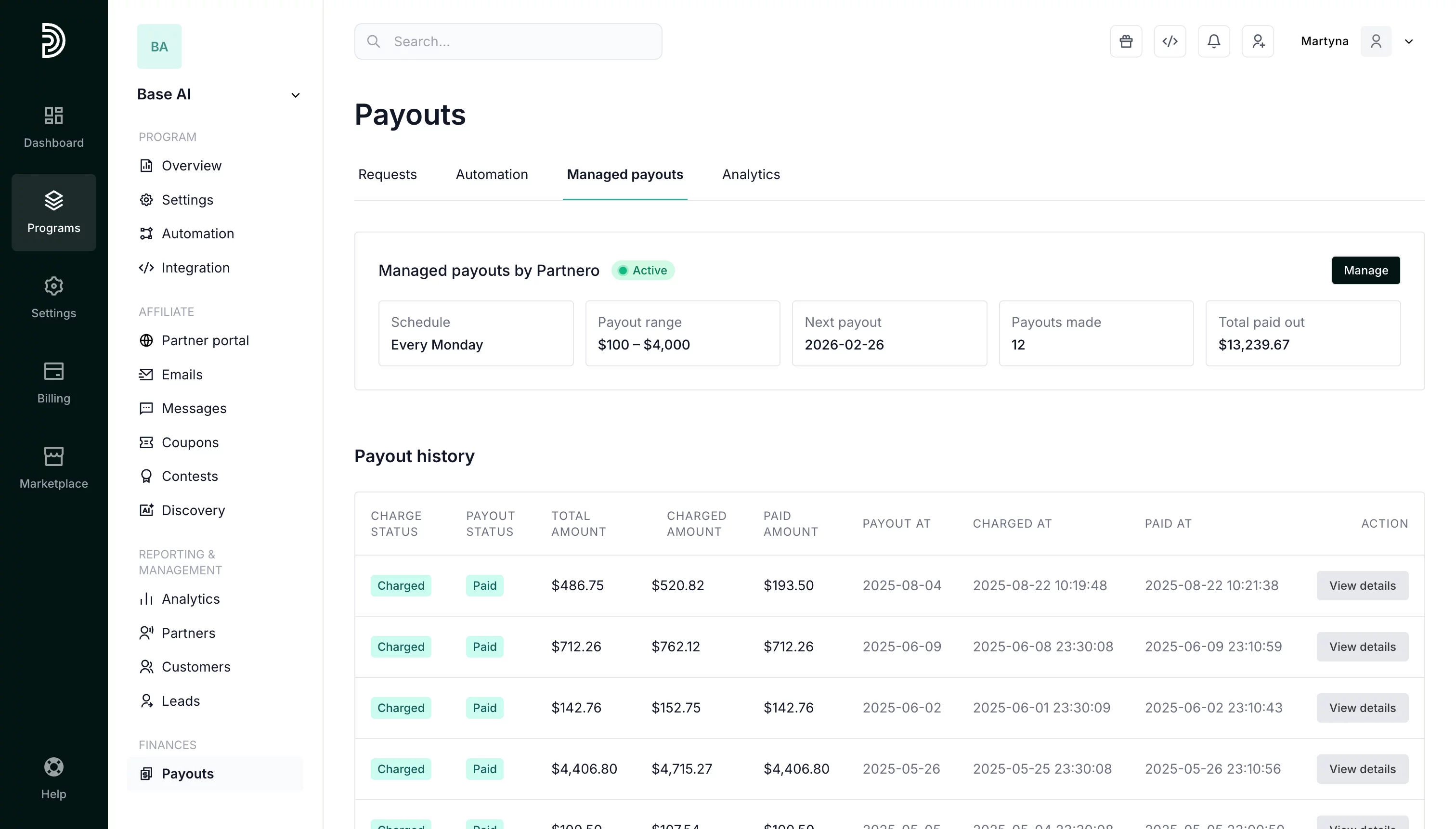 Managed affiliate payouts by Partnero